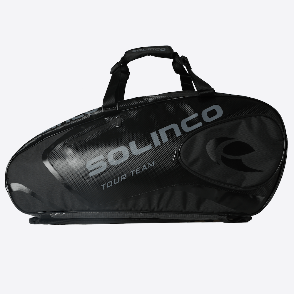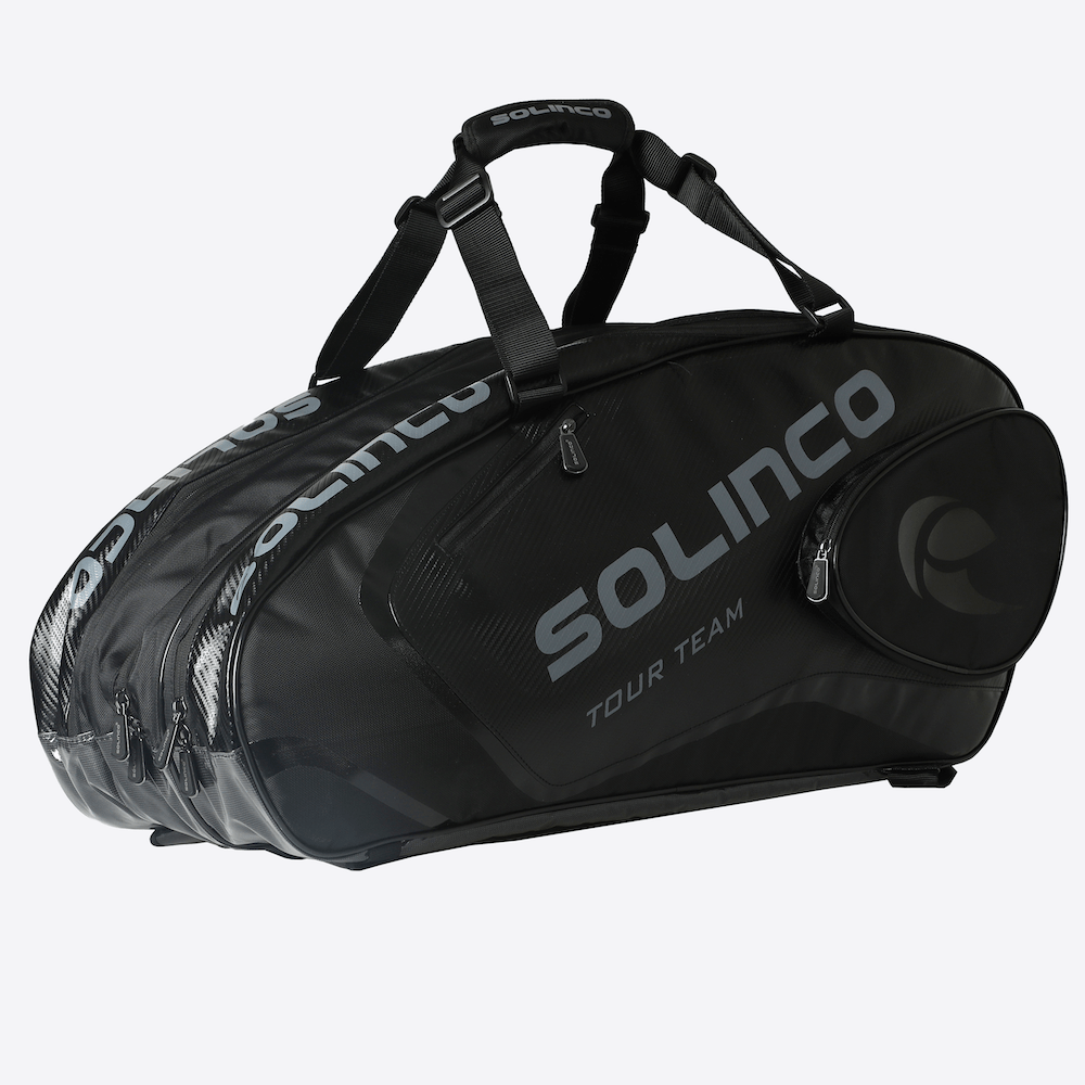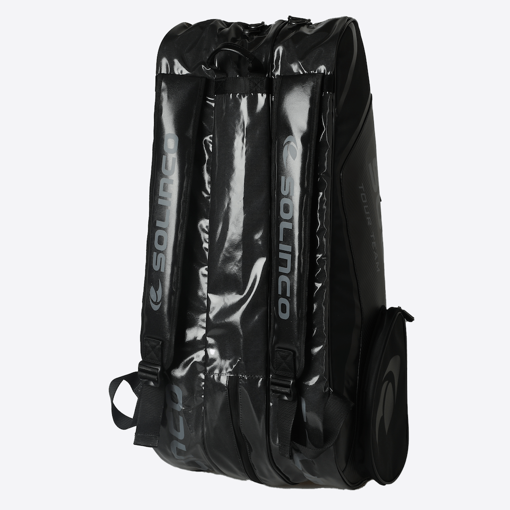 Dois compartimentos para raquetes forrados com Temprotechnology para proteção extra. O compartimento do meio pode ser usado para mais do que raquetes ou outro equipamento. O saco consegue armazenar até 15 raquetes e com espaço suficiente para guardar pequenos acessórios nos dois bolsos laterais.